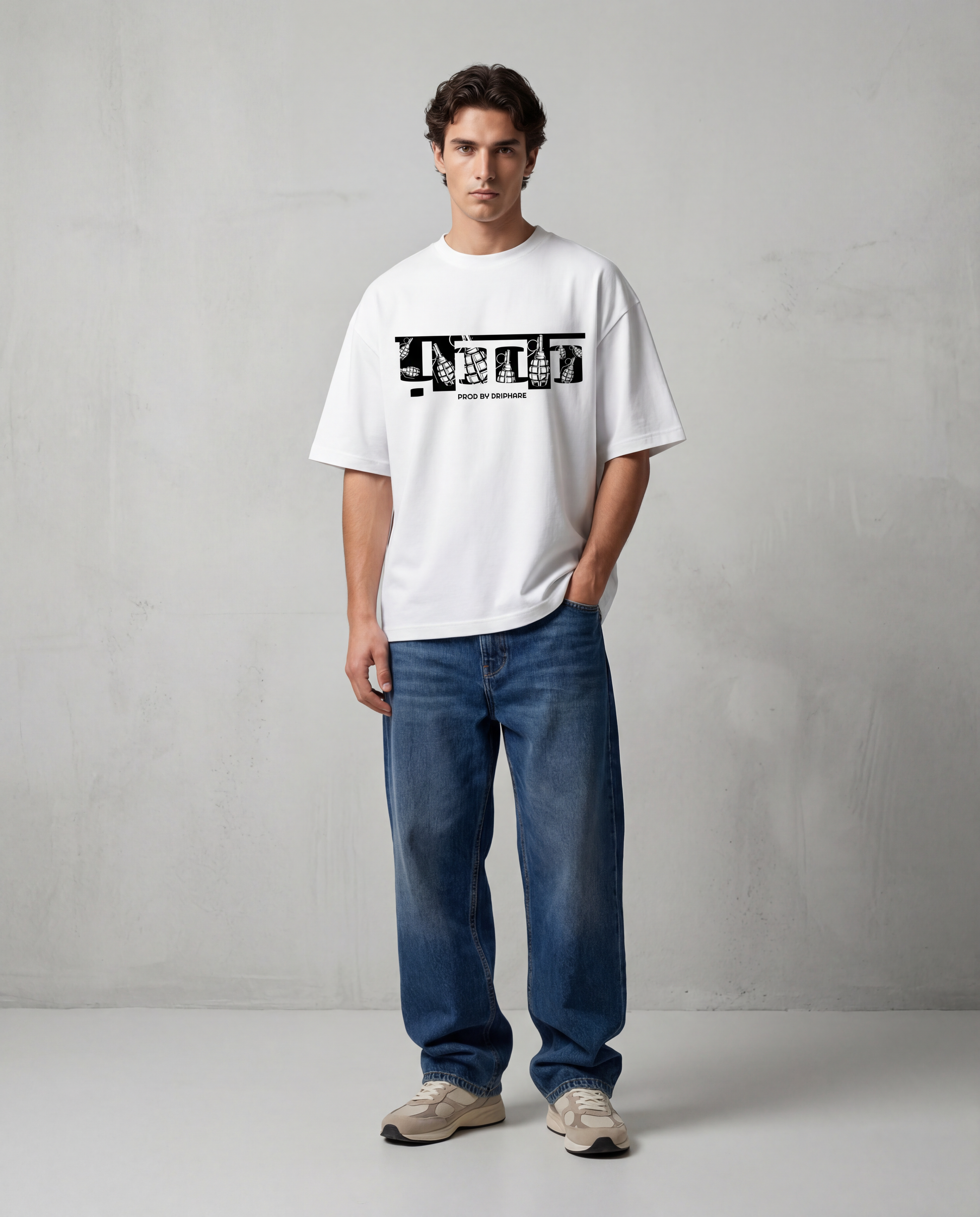 This tee feels like an opening sequence. “INIT” signals the start raw, unfiltered, and intentional. The grenade-filled lettering adds tension beneath the clean layout, suggesting controlled chaos rather than noise. Minimal in color and, sharp in concept, this is Driphare at its most industrial