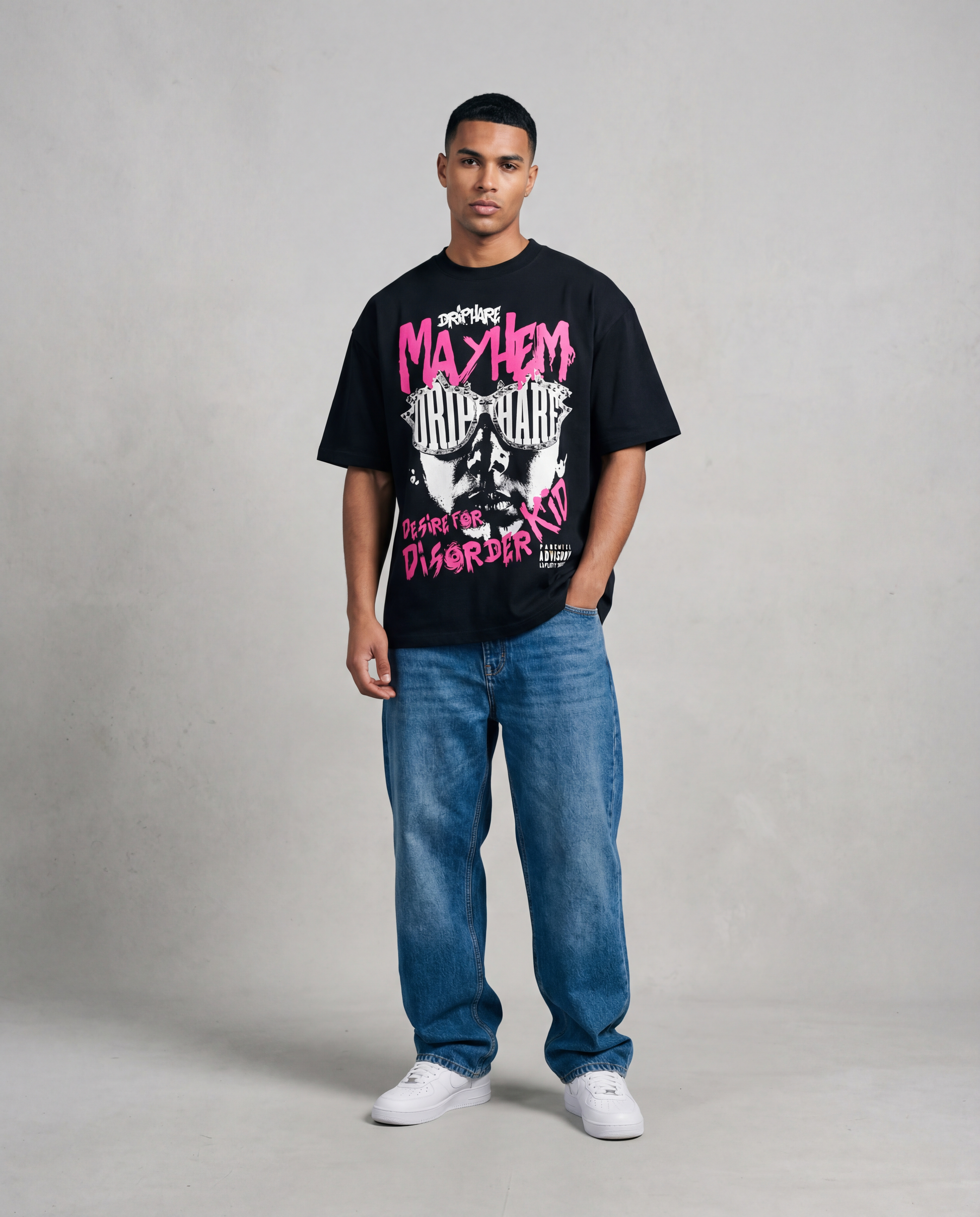 Some people need structure. Rules, schedules, clean lines. You? You thrive when shit gets chaotic. Skull wearing broken shades, hot pink "MAYHEM" dripping across the design"Desire for Disorder Kid" because you were never meant for the straight path. Black cotton, neon contrast print, parental advisory. When everything falls apart, you're still standing, still smiling.