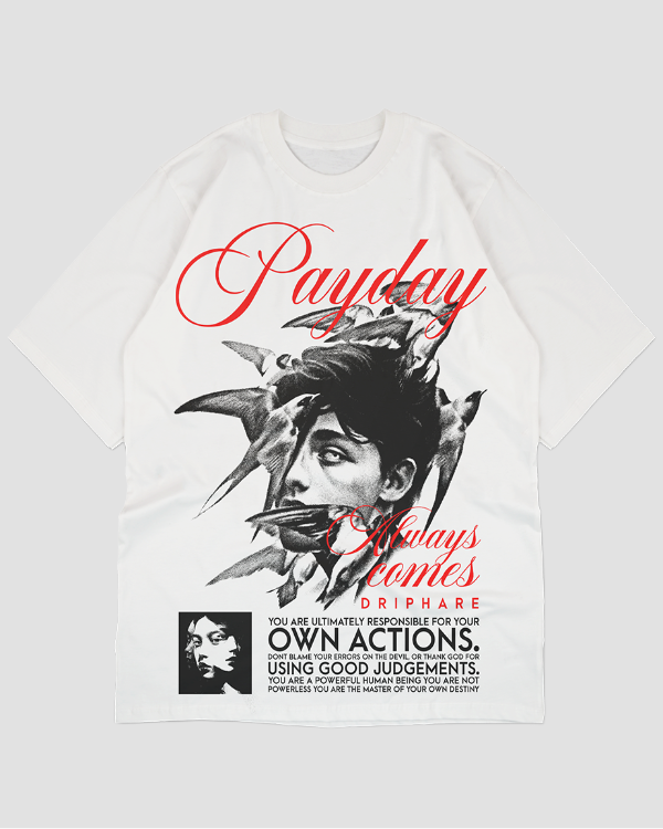 You think you got away with it? Choices unpaid, karma on layaway, consequences deferred? That haunting face knows better. "Payday Always Comes" in red script—not a threat, just a fact. Every action settles eventually. You're responsible, always were. White cotton, vintage portrait print, distressed aesthetic, oversized. The reckoning wears well.